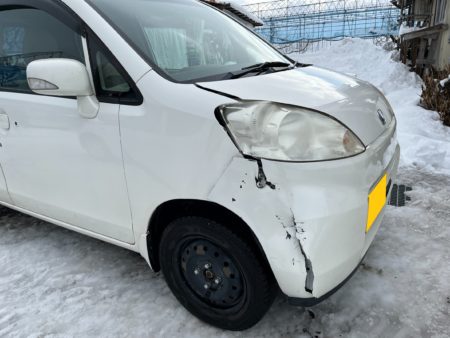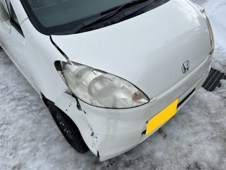 ▼フロントバンパーが大きく割れ、フェンダーもへこんでしまっています。