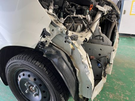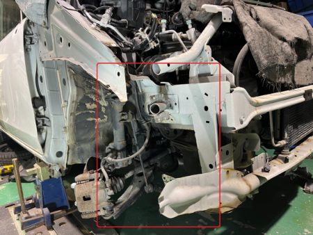 内部の骨格のラジエーターコアサポートが歪んでいました。