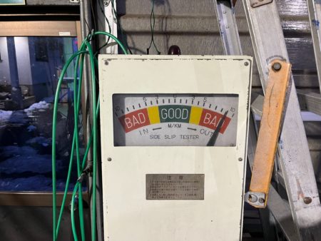 ▼足回りが歪んでいないか、サイドスリップテスターでタイヤの向きを点検します。