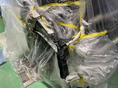 ▼フロントバンパーやヘッドライトを取り外したところです。