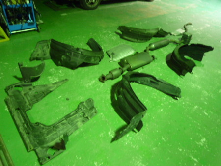 取り外された、車のアンダーカバーやマフラー、タイヤハウスのカバー類になります。