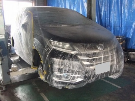 ▼ ボディ全体の塗料がかかっては欲しくない部分を専用のビニールシートで養生(マスキング)を行います。