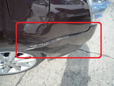 ▼まず、リアバンパーです。左側が大きくへこんでいます。