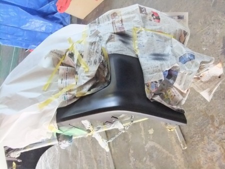 ▼周囲を養生し、サフェーサーを吹き付けます。