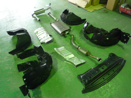 取り外された、車のアンダーカバーやマフラー、タイヤハウスのカバー類になります。