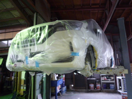 ボディ全体の塗料がかかっては欲しくない部分を専用のビニールシートで養生(マスキング)を行います。