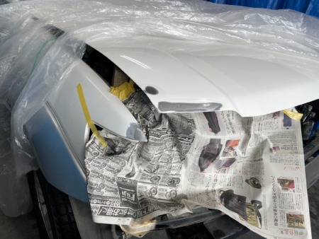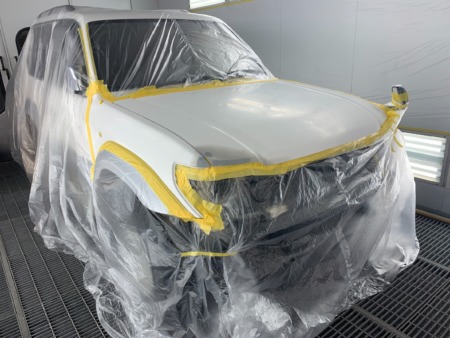 ▼ 車を塗装専用ブースに移動してボンネット表面とフェンダーの塗装をします。
