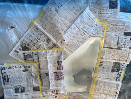塗装の前の一連の作業として、塗装面を細かいサンドペーパーで削って「足付け」を行い塗装面の油汚れやワックス分をしっかり落とす「脱脂」行います。