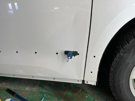 ▼ ドアの凹みは裏から直せないので引っ張って直す「プーリング」作業を行います。