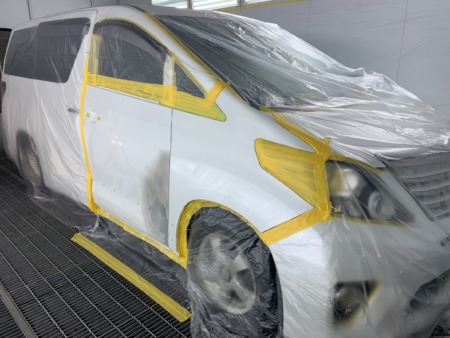 ▼ 車を塗装専用ブースに移動してフロントドア表面と隣接するフェンダーのボカシ塗装をします。