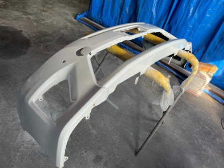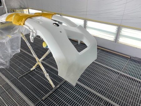 ▼ フロントバンパーは一旦車体から取り外して傷の補修をします。
