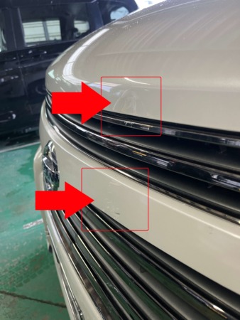ボンネットとグリル部分のパネルにへこみやキズがあります。
