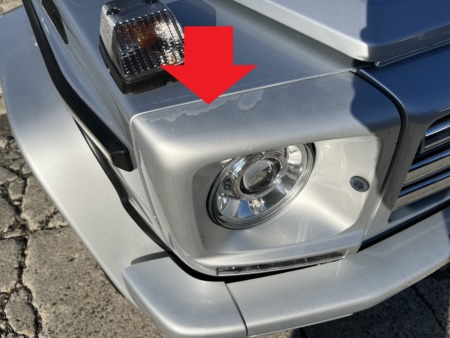 ▼ オーバーフェンダーやフロントバンパーコーナー部分にもクリア剥がれが発生しています。