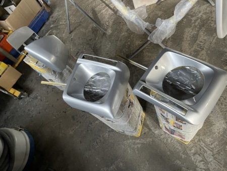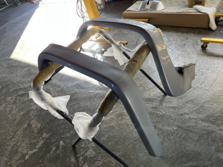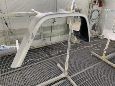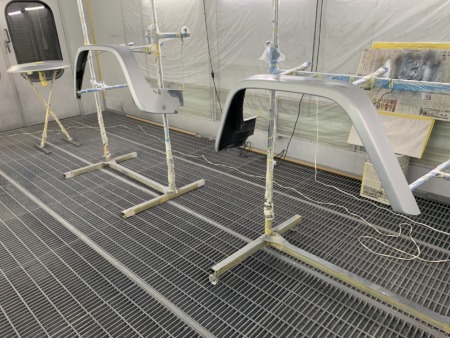▼ フェンダーの塗装が完了して塗装ブースから外へ移動したところです。