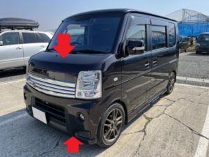 ▼フロントバンパーにも小傷があり、ナンバープレートも曲がってしまいました。