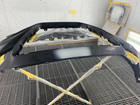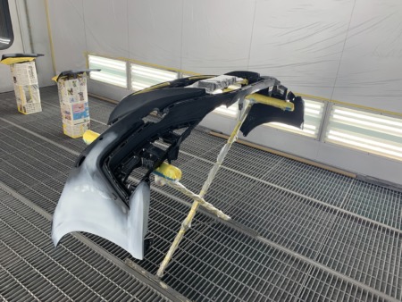 ▼ バンパーの塗装は専用のブースで行いゴミや埃の付着を防止します。
