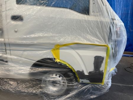 ▼ フロントドア右下側に擦り傷とヘコミ傷があり、鈑金で修理していきます。
